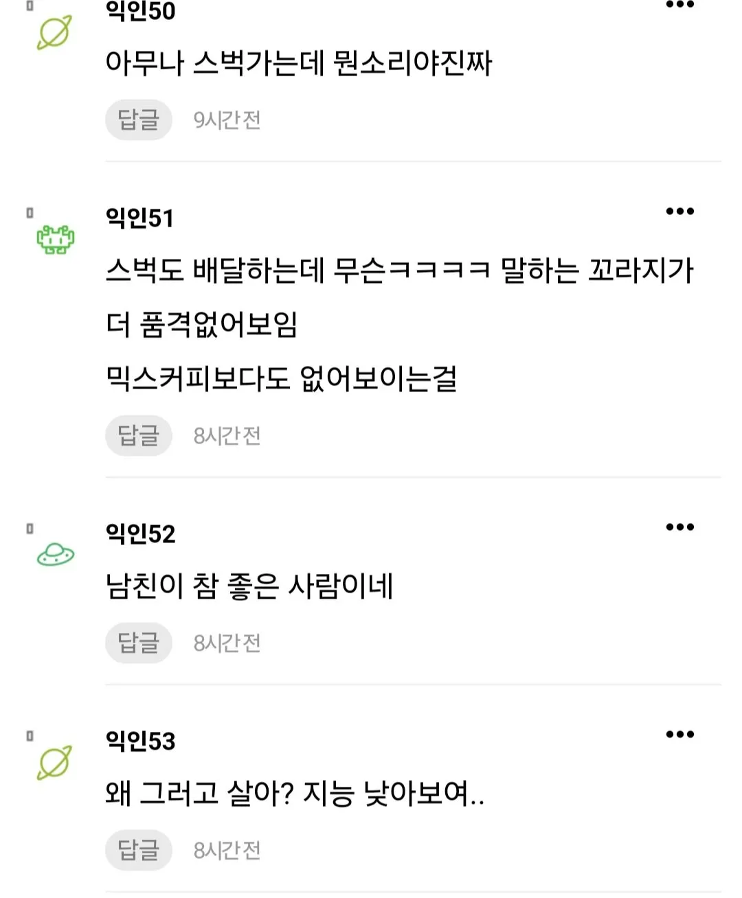 스타벅스에 배달기사 있어서 품격떨어진다는 여자친구