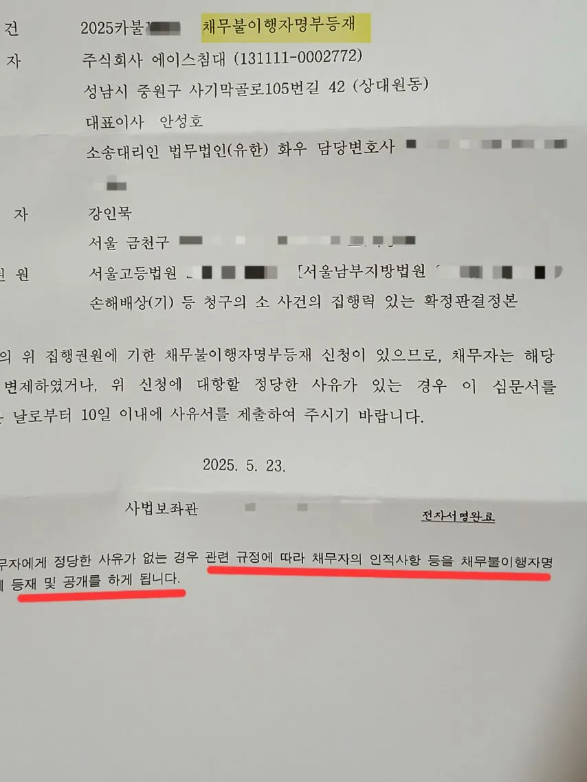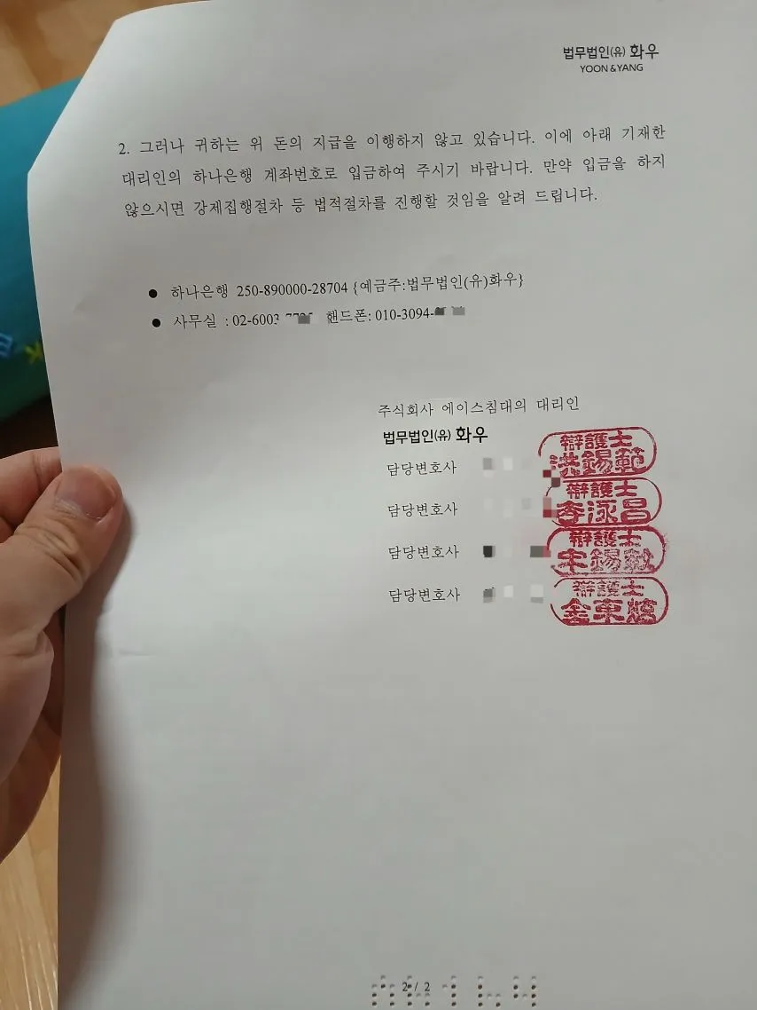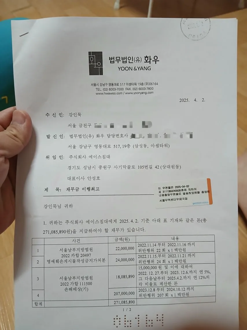 (주)에이스침대는 대형로펌을 앞세워 2억7천만원을 갚으라는 내용증명을 보내 압박하고, 가재도구에는 압류 딱지를 붙이고, 채무불이행자로 만들었습니다.
