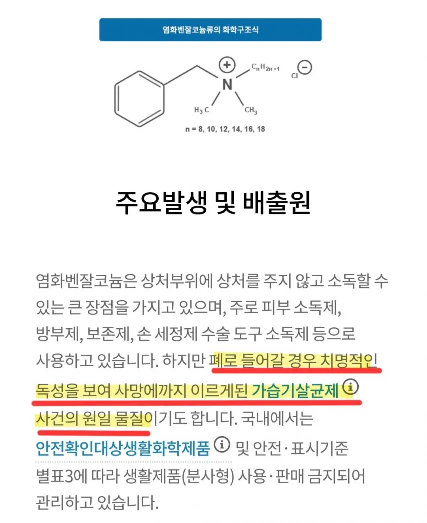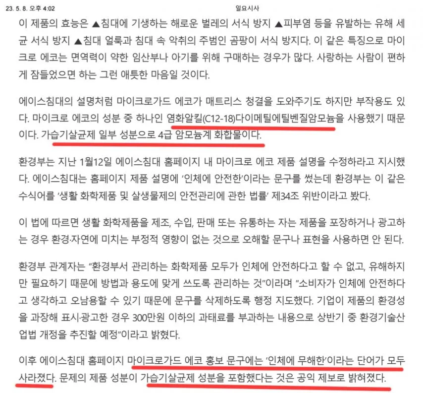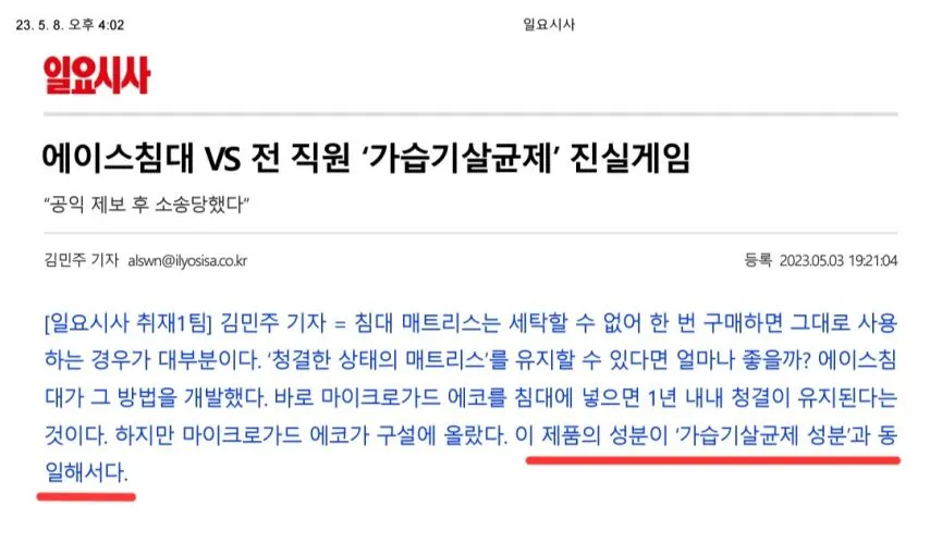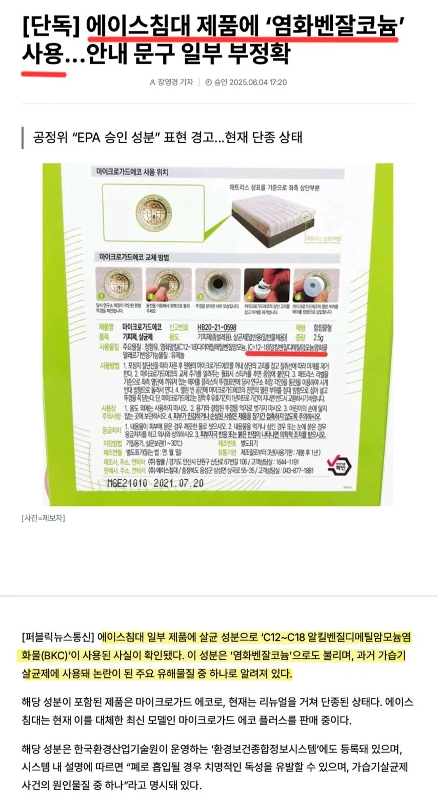 침대 업계 1,2위를 다투는 에이스침대의 모든 매트리스에 사용되는 침대용 살균제에 폐로 흡입 시 치명적인 독성물질 C12-C18, 알킬벤질디메틸암모늄염화물(염화벤잘코늄,BKC)이 주요물질로 사용되었습니다.