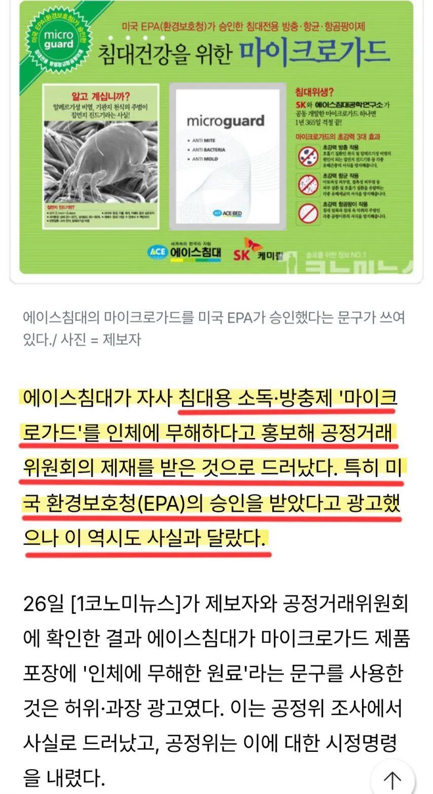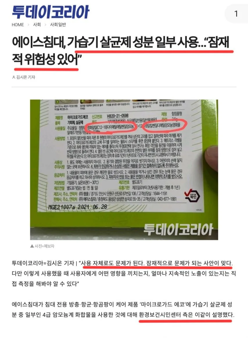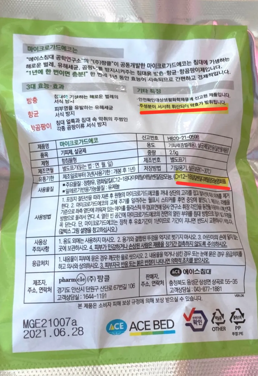 에이스침대 마이크로가드 에코 주요물질인 C12-C18,알킬벤질디메틸암모늄염화물은 "폐로 들어갈 경우 치명적인 독성을보여 사망에까지 이르게된 가습기살균제 사건의 원일 물질입니다.