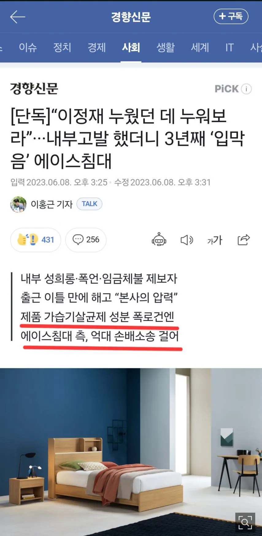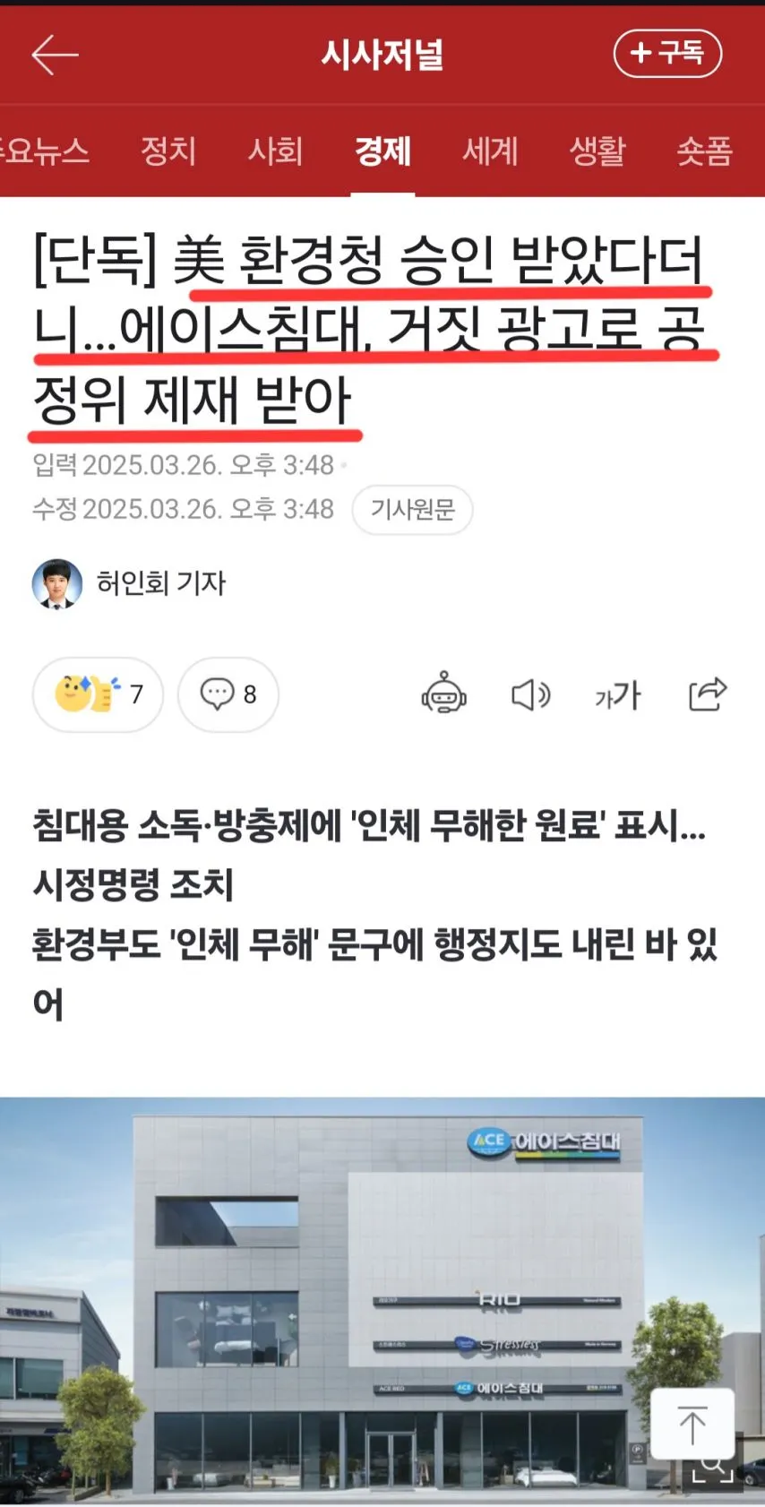 그리고, (주)에이스침대 안성호 사장은 무혐의 처분을 받은 사건을 재고소하여 서울남부지검 검사로부터 징역3년을 구형받고 현재 선고를 기다리고 있습니다.