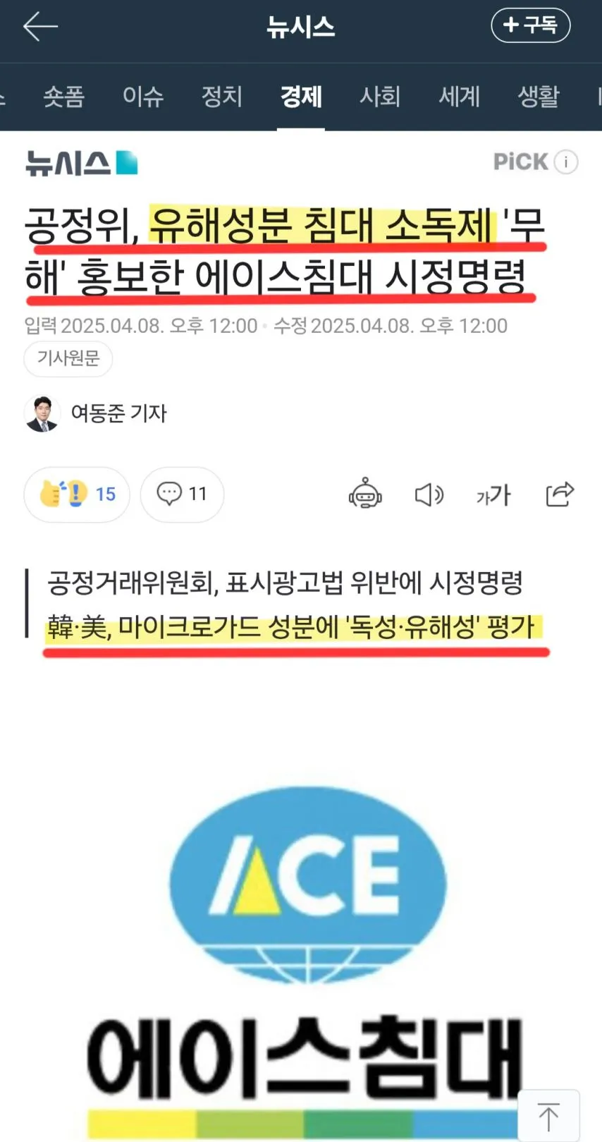 저는 (주)에이스침대에 가습기살균제 원인성분이 사용된 사실을 알리고 있는 강인묵이라고 합니다.